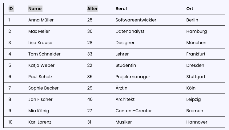 Die Tabelle soll darstellen, wie Daten strukturiert werden. Beispielsweise könnte sie eine Liste von Kunden enthalten: